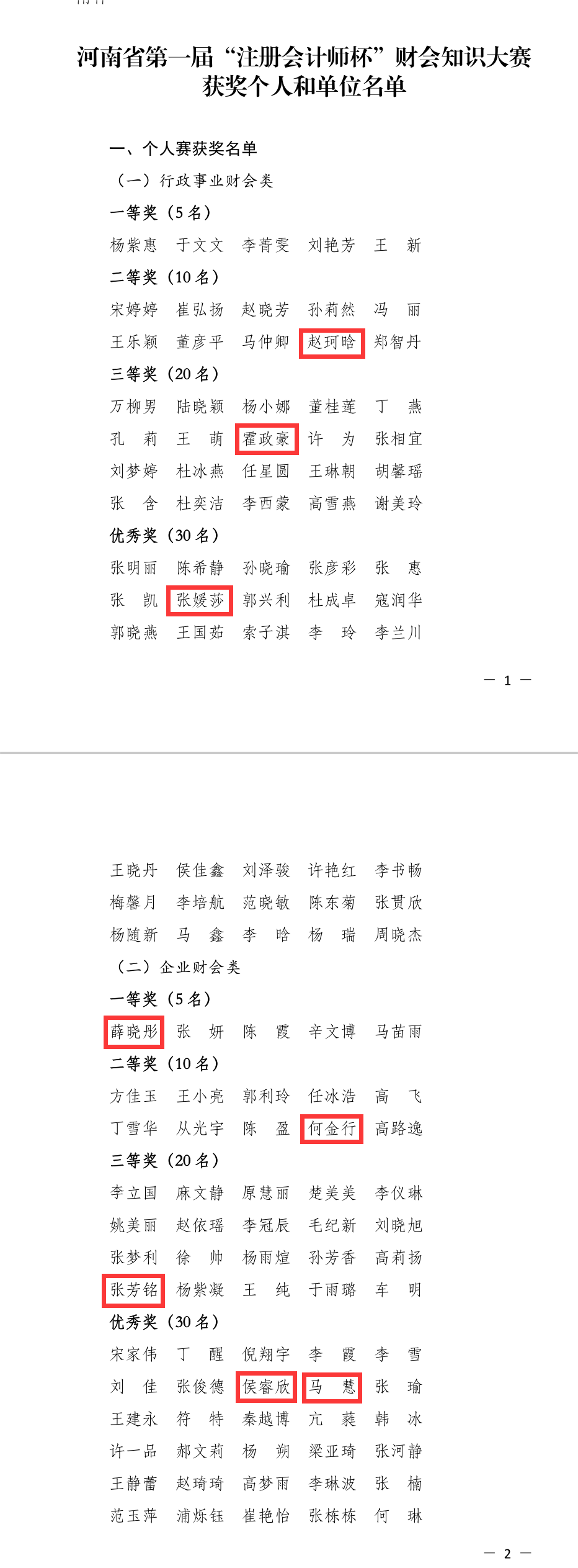 近日,由河南省财政厅主办、河南省注册会计师协会承办的河南省第一届“注册会计师杯”财会知识大赛公布最终获奖名单。经过激烈角逐,太阳成集团tyc122ccvip的赵珂晗、薛晓彤等8位员工从130多位选手中脱颖而出,分别荣获一等奖、二等奖、三等奖及优秀奖。